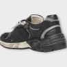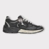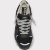 Empiècement en plastique noir argenté au niveau des lacets gris.